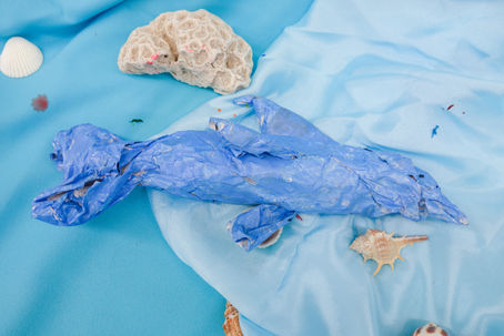 「新聞紙を使って、干潟の生きもののオブジェを作ろう」皆さんの作品です。